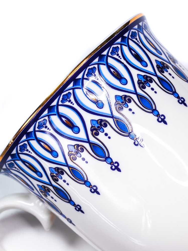 На изделии нанесена деколь в виде восточного узора в синих тонах с золотом.
