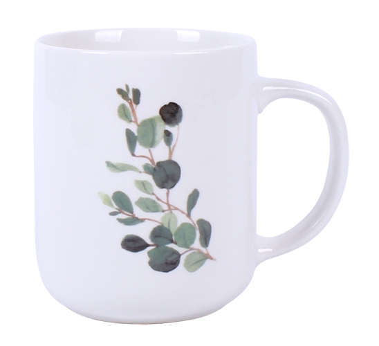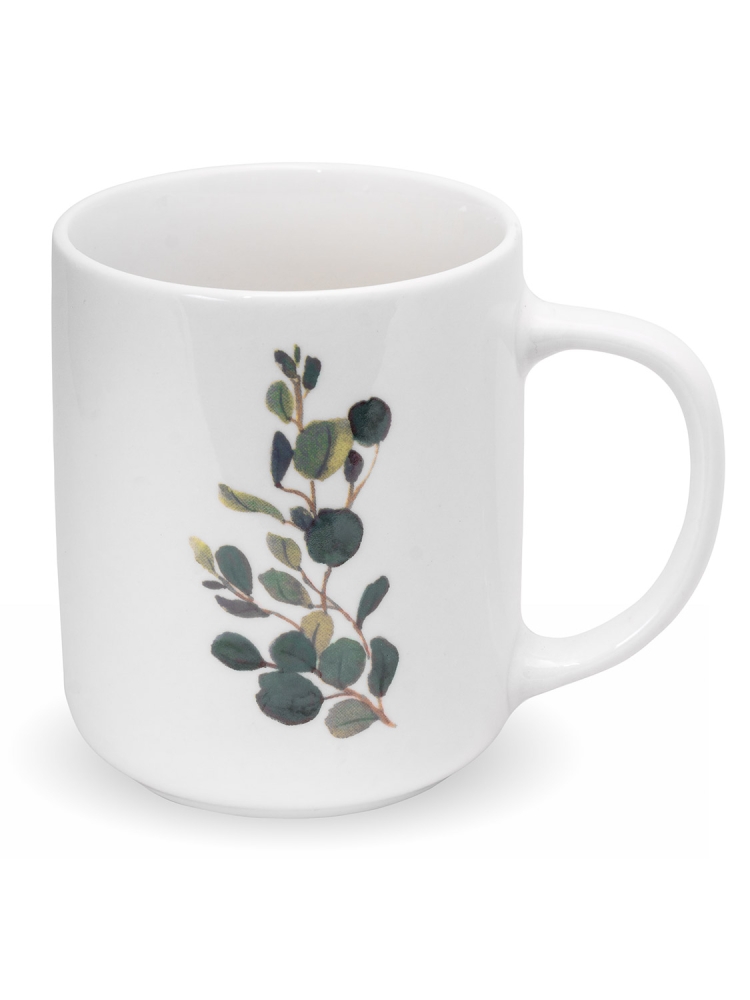Фарфоровая кружка с веточками эвкалипта. Размер 10.4х8.5х12 см. Фактический литраж 400 мл. Можно использовать в посудомоечной машине и в СВЧ.
