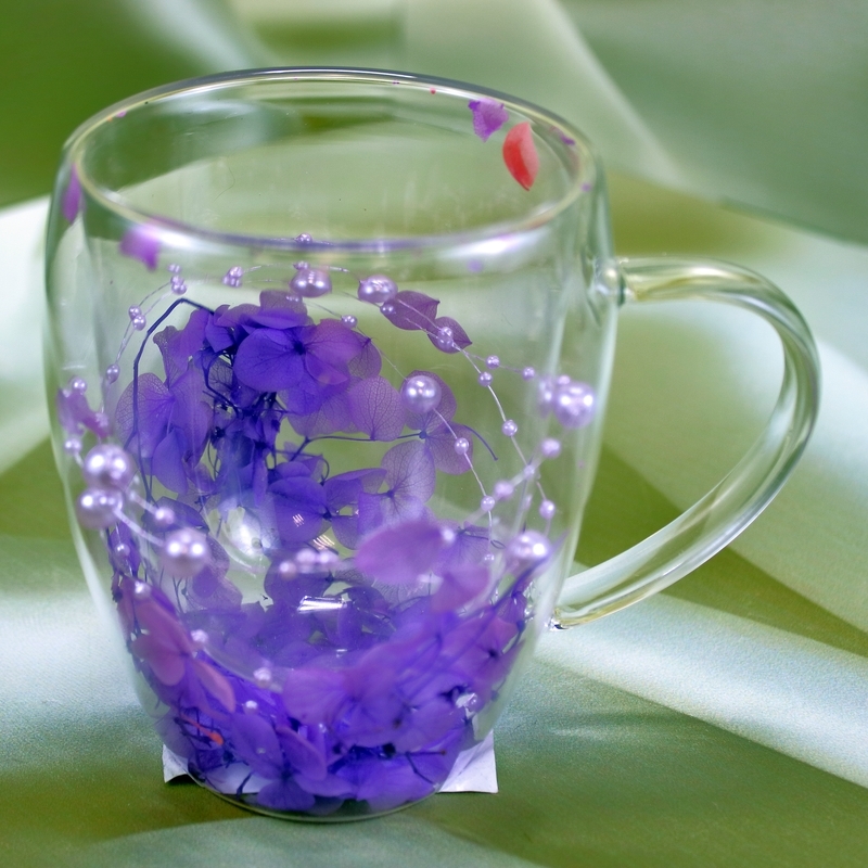 Кружка изготовлена из прозрачного стекла и имеет двойные стенки. Интересная особенность изделия - внутри прозрачных стенок находятся красивые сухоцветы и бусины. Они подарят положительные эмоции и создадут теплую атмосферу уюта.