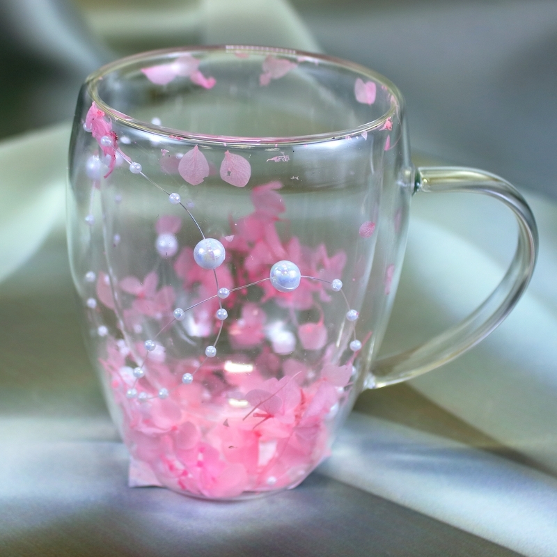 Кружка изготовлена из прозрачного стекла и имеет двойные стенки. Интересная особенность изделия - внутри прозрачных стенок находятся красивые сухоцветы и бусины. Они подарят положительные эмоции и создадут теплую атмосферу уюта.