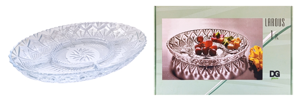 Менажница стеклянная размером 30 х 20 х 4.5 см. Менажница имеет 5 секций и очень красивую рельефную форму. Объем 1 л. В подарочной упаковке. Торговая марка "Kaveh" (Иран). Можно использовать в посудомоечной машине, не использовать в СВЧ.