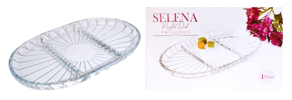 Менажница стеклянная размером 28.5x17x2.5 см. Имеет 3 секции. В подарочной упаковке.Торговая марка "Kaveh" (Иран). Можно использовать в посудомоечной машине, не использовать в СВЧ.