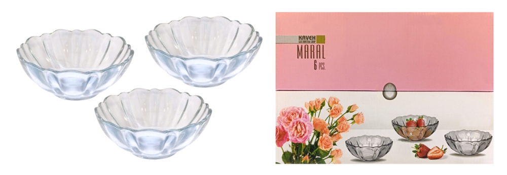 Набор из 6 стеклянных салатников размером 10*10*4 см, объемом 160 мл. В подарочной упаковке. Торговая марка "Kaveh" (Иран). Можно использовать в посудомоечной машине, не использовать в СВЧ.