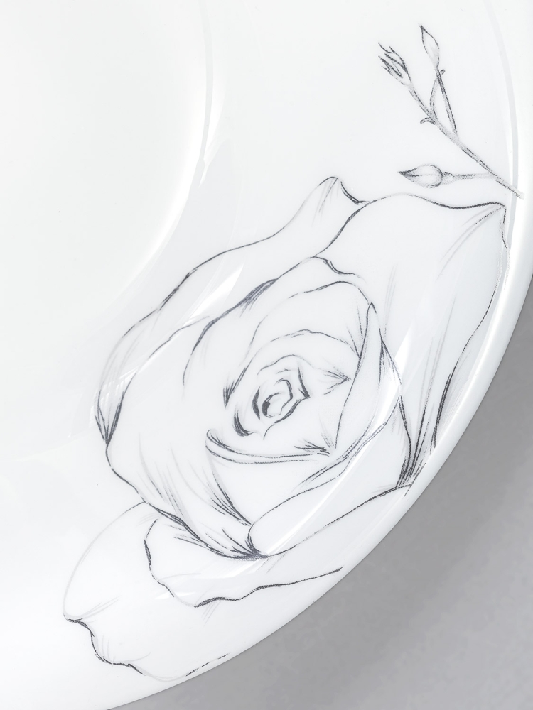 Коллекция "Эскиз розы" изготовлена из белоснежной тонкой стеклокерамики с легким, едва заметным узором.