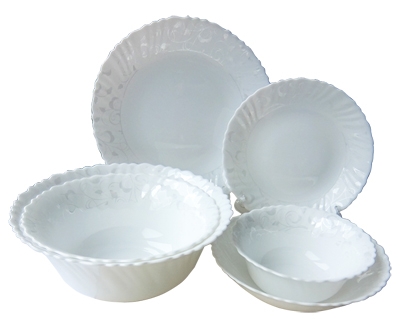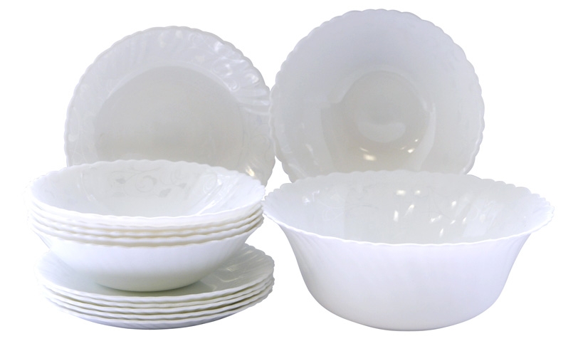 Коллекция посуды "ИЛЬ-ДЕ-ФРАНС" из тонкой стеклокерамики с изящным дизайном в виде веточек серебряного цвета . В набор входит: тарелка десертная 19 см - 6 шт,, миска суповая 19 см - 6 шт,, салатник 20,5 см - 1 шт.