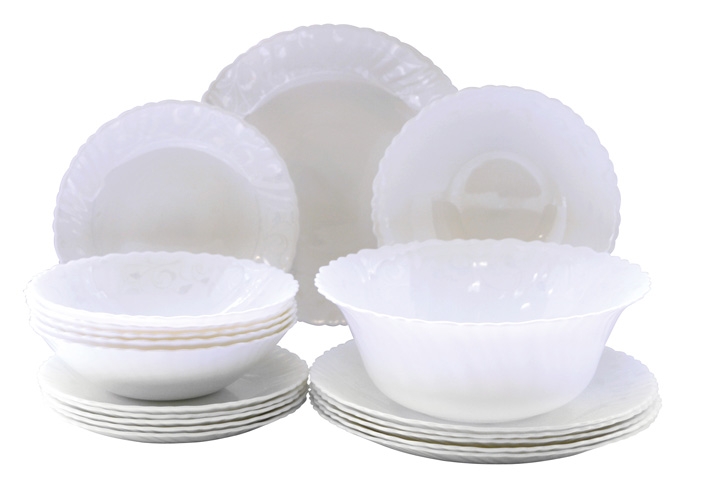 Коллекция посуды "ИЛЬ-ДЕ-ФРАНС" из тонкой стеклокерамики с изящным дизайном в виде веточек серебряного цвета. В набор входит: тарелка десертная 19 см - 6 шт., тарелка обеденная 24 см - 6 шт., миска суповая 19 см - 6 шт., салатник 22,5 см - 1 шт.