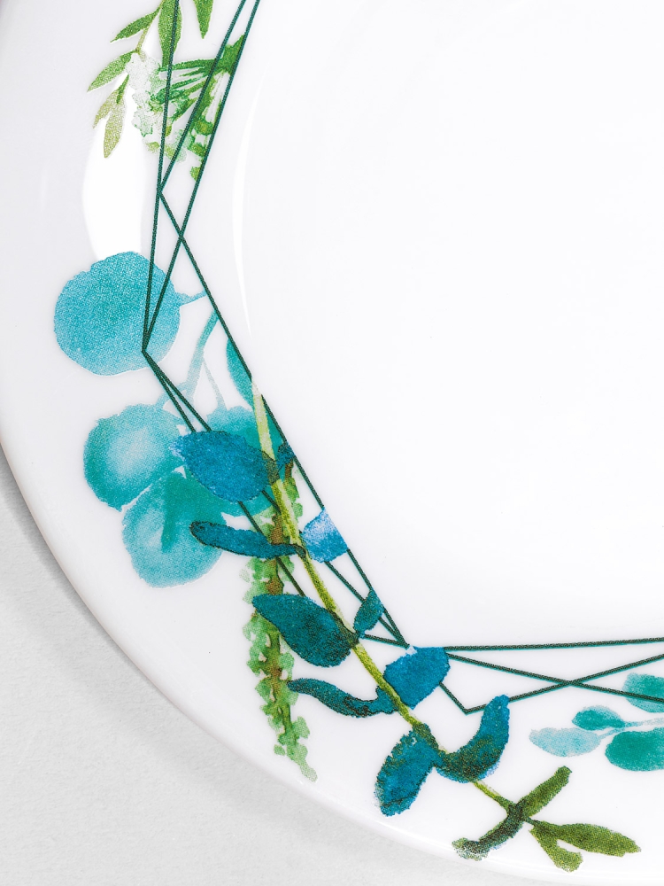 Коллекция "Акварельный букет" изготовлена из белоснежной тонкой стеклокерамики с узором.