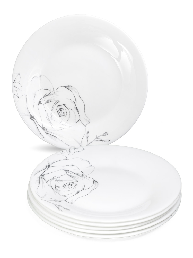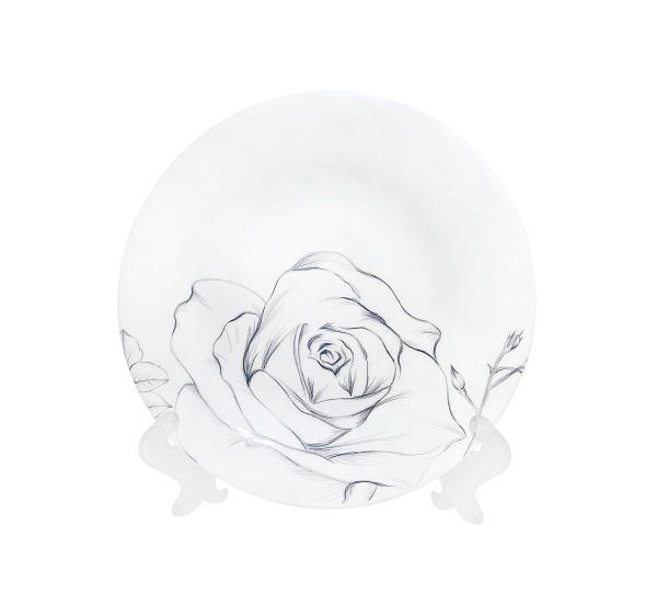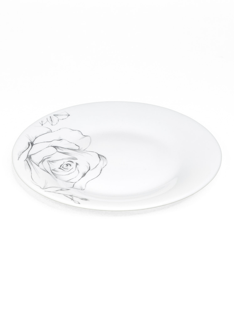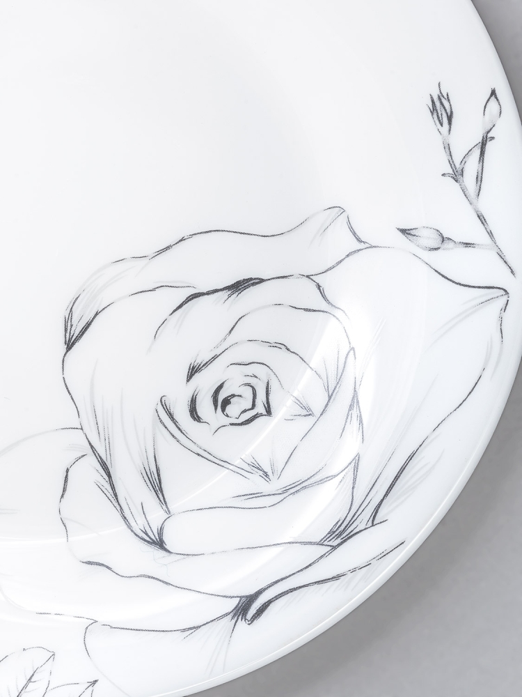 Коллекция "Эскиз розы" изготовлена из белоснежной тонкой стеклокерамики с легким, едва заметным узором.