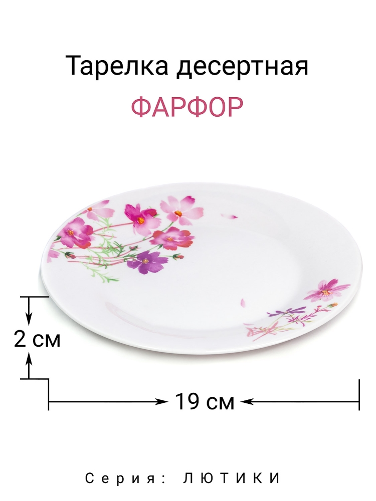 Тарелка десертная 19 см с цветочным дизайном "Лютики". Материал: фарфор. Размер 19 х 19 х 2.2 см. Можно использовать в посудомоечной машине и в СВЧ. Сделано в Китае.