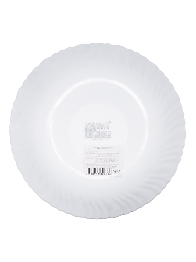 Продукция имеет волнистый край. Диаметр 24см. Торговая марка "МФК". Можно использовать в посудомоечной машине и СВЧ, не использовать на открытом огне.