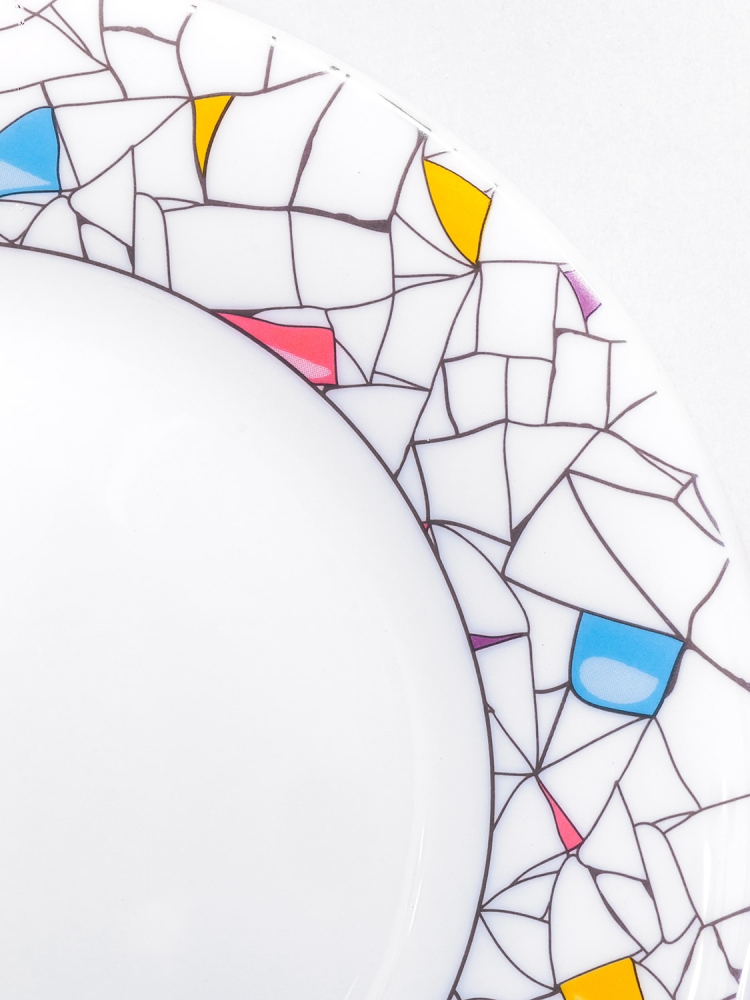 Коллекция "Мозаика" изготовлена из белоснежной тонкой стеклокерамики с мозаичным узором.